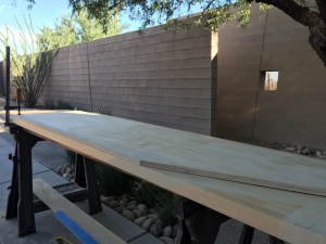 Martha took several photographs of the second set of templates, including these two images, (below). Todd wasn’t satisfied with the precision of his first two templates, so he created two more using 5/8 inch plywood, and these two templates were used to scribe the maple butcher block panels on a rather pleasant October afternoon roughly two weeks ago…
