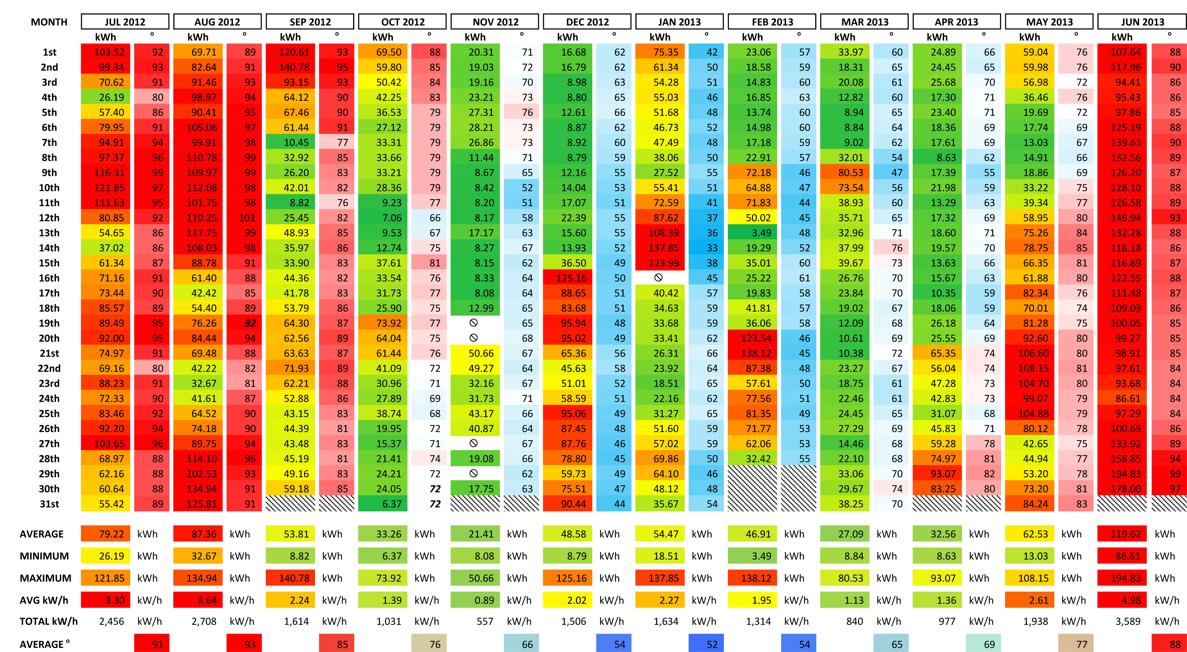 - If I had to average temperatures to fill a gap, they are shown in both bold and italics, (there were no occurrences since October 2012).