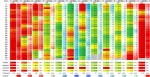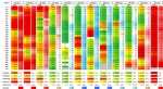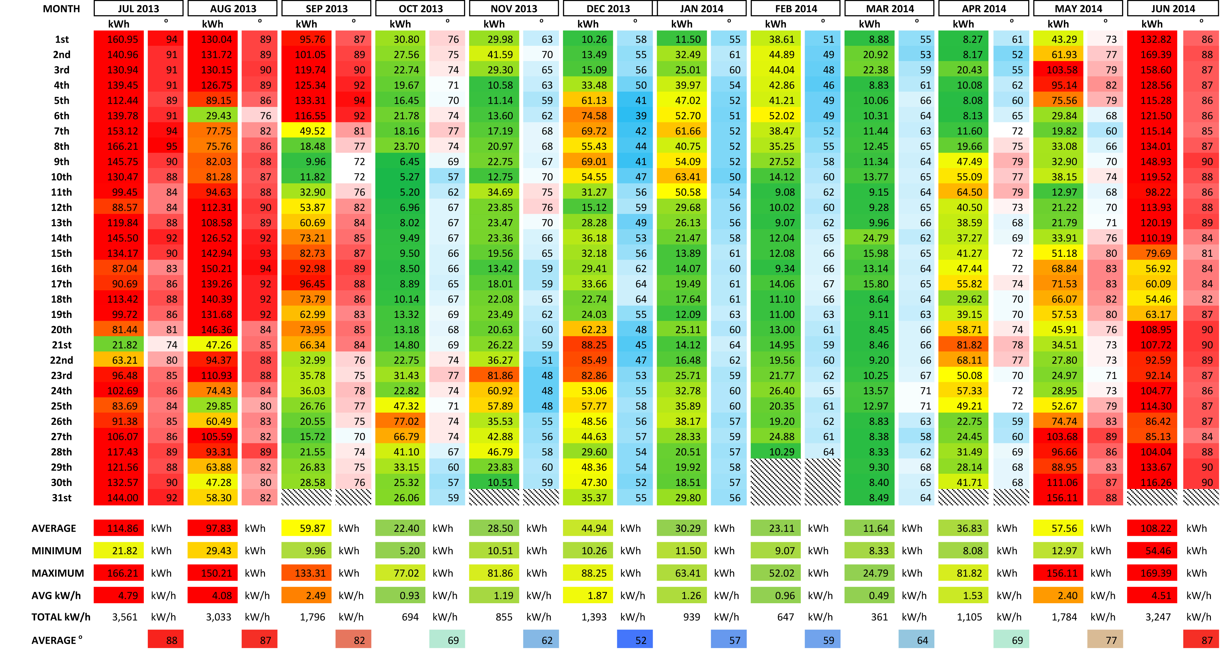- The color key for kWh per day is green for the lowest values, (meaning values below 10 kWh for the entire 24 hour period), yellow for values hovering around 50 kWh for the entire 24 hour period and red for values at, or above, 100 kWh for the entire 24 hour period.