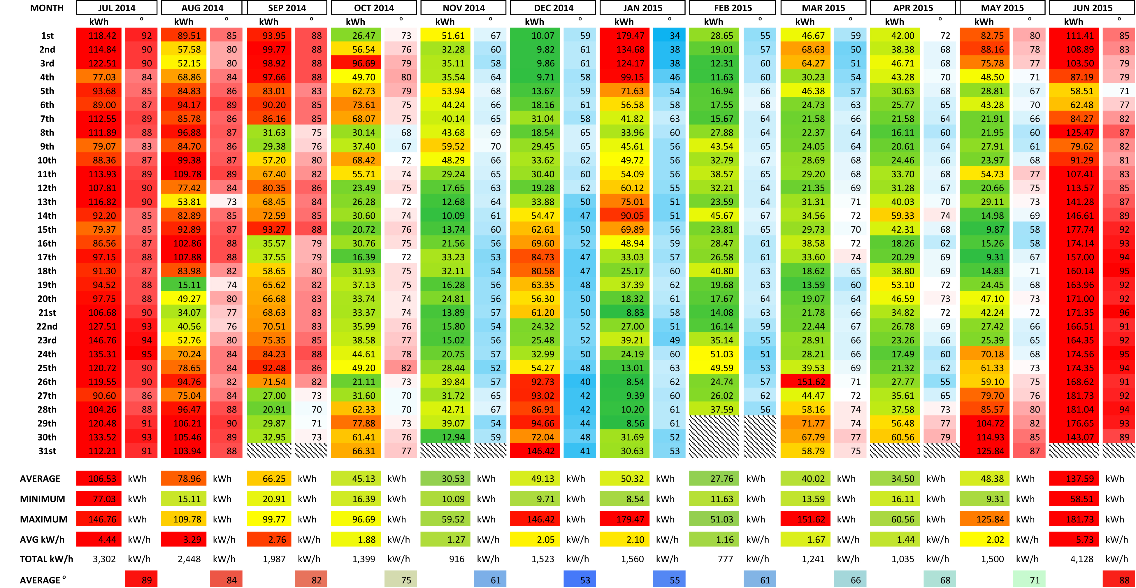 - Total usage from July 1st 2012 to June 30th of 2013 was 20,200 kWh. Total usage from July 1st of 2013 to June 30th of 2014 was 19,600 kWh. Total usage from July 1st of 2014 to June 30th of 2015 was 21,800 kWh. Yes, you’ll notice an uptick – we used 9.5% more during the 2014-2015 period than the average of the prior two periods (2012-2013 and 2013-2014). I believe this is reflective of the simple fact we’ve occupied the house full-time vs. occupying it for what amounted to less than three months in prior years.