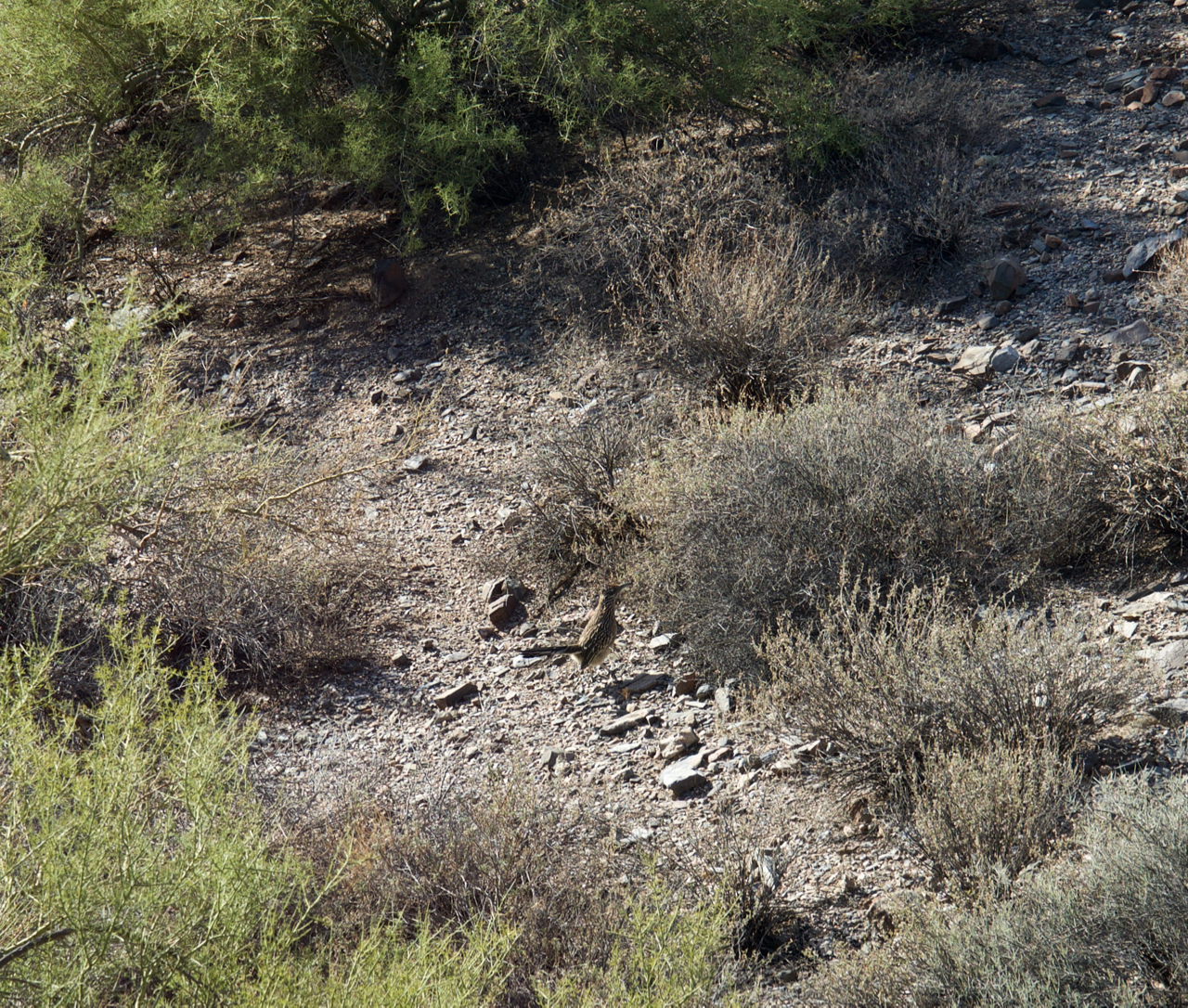 Earlier today, Martha captured a resourceful roadrunner out hunting just below the south patio beneath the Dining Room – apparently it was successful too!
