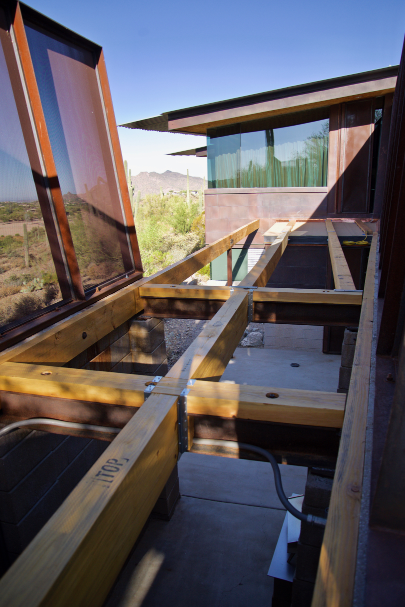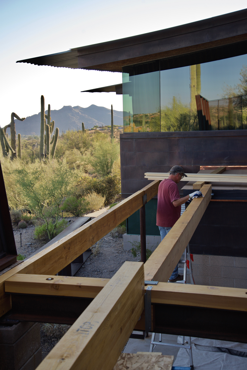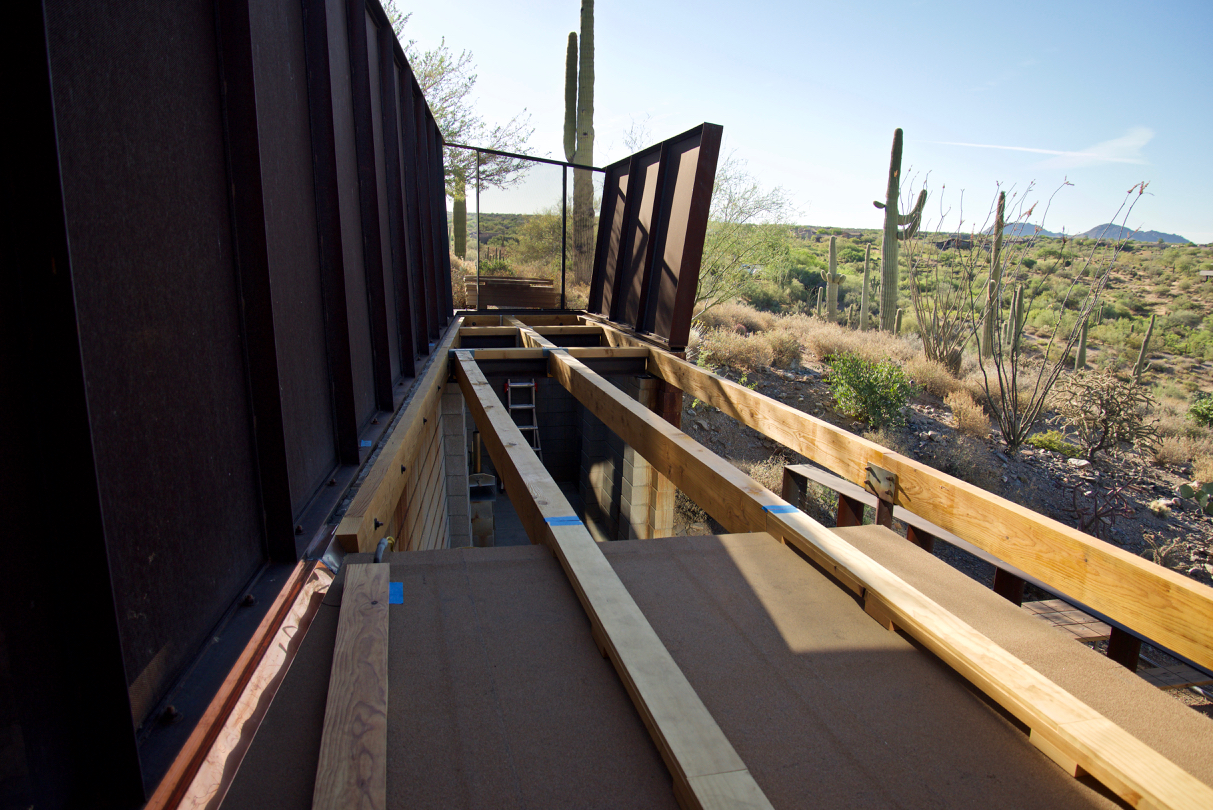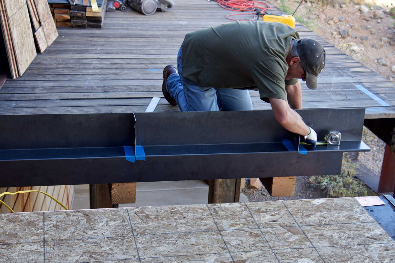 Update #10: Days 32 – 35 = phase one of the copper flashing is done! Tin Works installed flashing today! The flashing/trim that’s found on the exterior wall of the Laundry above the door is now in place. I used this short lull to fabricate two templates for the beam that “floats” along the southern edge of the deck above the Laundry window. You can catch a glimpse in the background in the lower left-hand corner. On deck: steel will go down next!