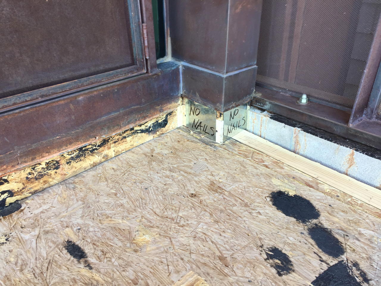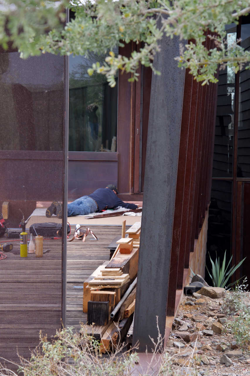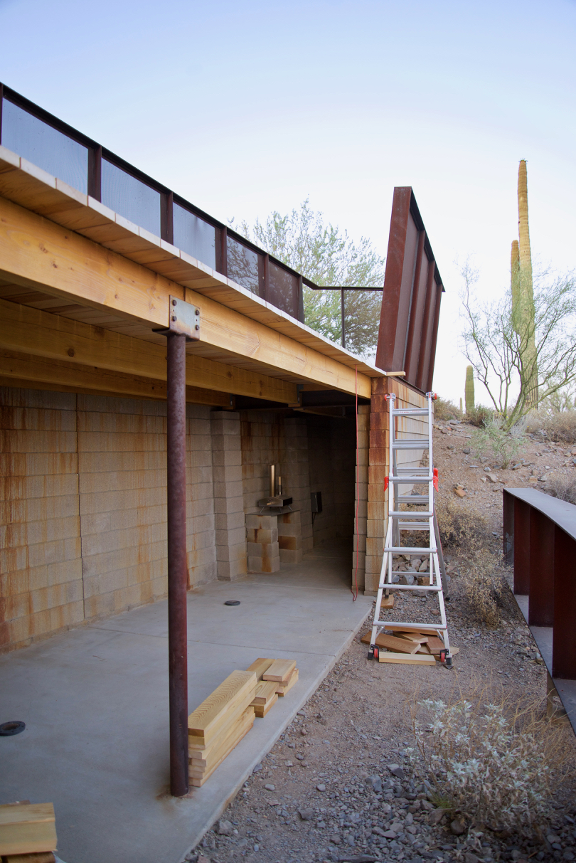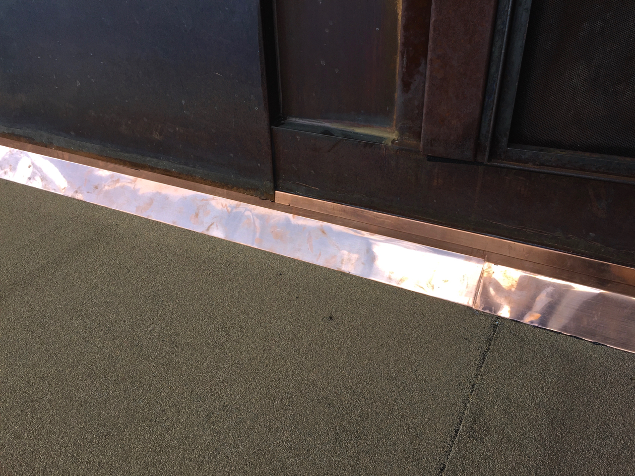 Update #10: Days 32 – 35 = phase one of the copper flashing is done! Tin Works installed flashing today! The flashing/trim that’s found on the exterior wall of the Laundry above the door is now in place. I used this short lull to fabricate two templates for the beam that “floats” along the southern edge of the deck above the Laundry window. You can catch a glimpse in the background in the lower left-hand corner. On deck: steel will go down next!
