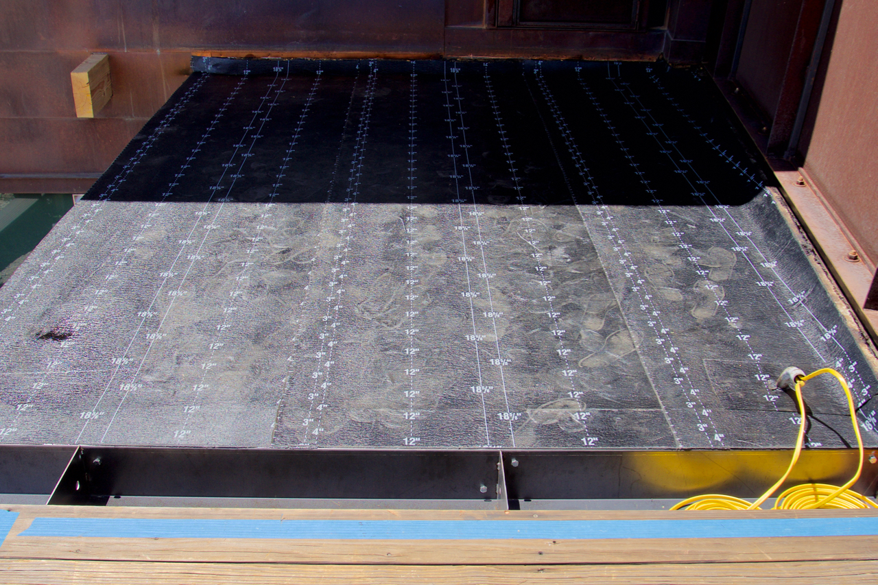 Update #14: Days 42 – 44 …one last item [before roofing]. I installed new cant strips yesterday, (Thursday), along the copper clad wall and the CMU wall. The cant strips provide a 45° surface to transition the two-part roofing membrane from a horizontal plane, (the roof), to a vertical plane, (the wall). Yup, 45° bevels in the corners and beveled tips at each end… 🙂