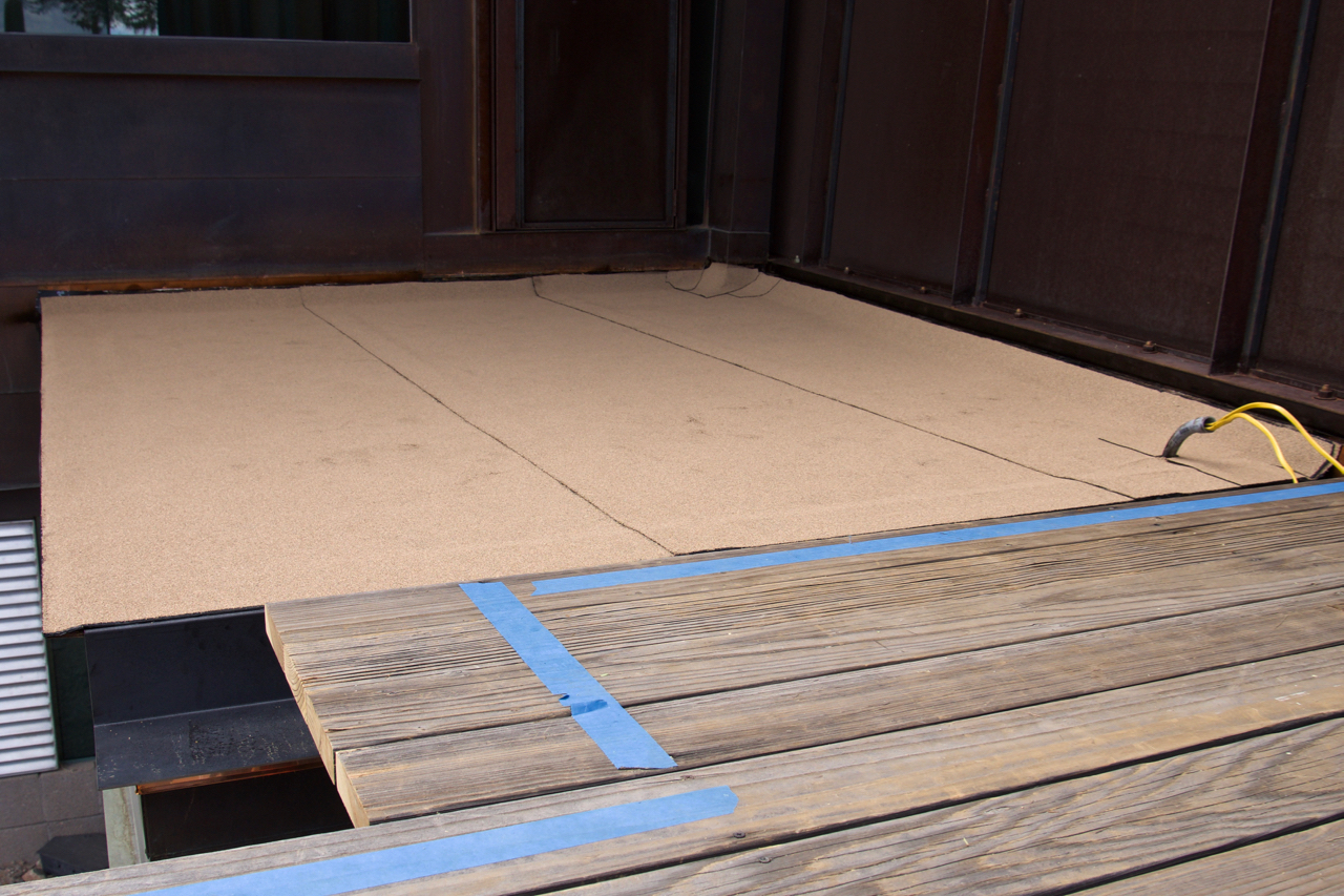 Update #29: Days 91 – 94 = final push…All 12′ & 10′ planks have been waterproofed and are now temporarily resting in place on the beams, but not before I took the time to caulk the steel seams and apply flashing to what will be all of the hidden horizontal surfaces. I suspect I’ll be done – I mean really done – by day 100.