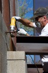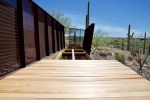Update #30: Days 95 – 100 = all done! I spent the last six days of the project caulking seams, applying the last of the flashing, cutting the 8′ planks to size, pulling them back out to coat them with Thompson’s and re-installing them. Martha helped me while I cut off the ends, (see below), and she captured the bottom two images early this morning, (Saturday). The steel railing will be craned back into place next Tuesday afternoon. 🙂