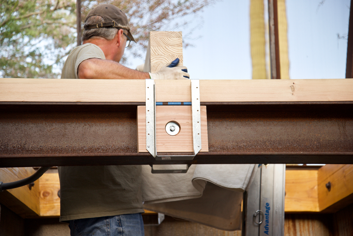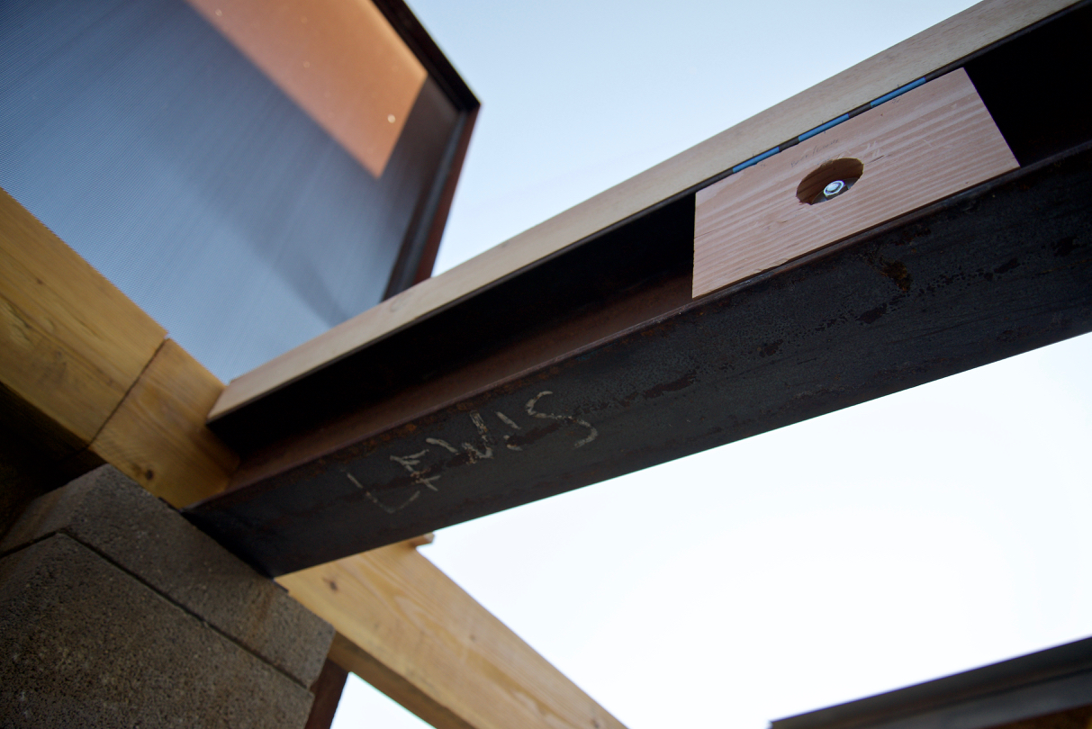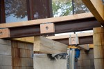 Update #25: Days 74 – 80 It’s coming together now! Ordered specially-cut beams for nailers attached to I-beams, treated first 10 cedar planks with Thompson’s, I-beams were re-welded back into place, I built the final versions of both nailers and blocking, then attached joist hangers and dropped glue-laminated beams into place!