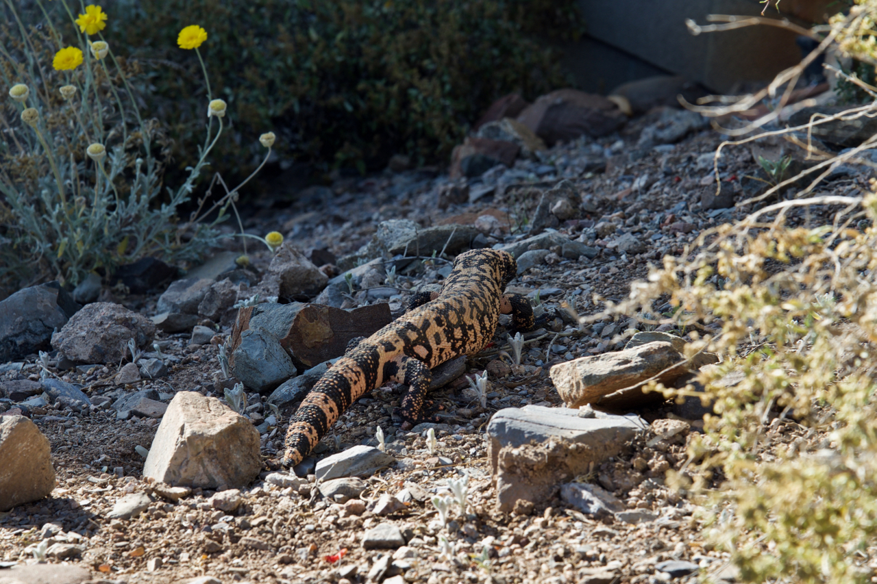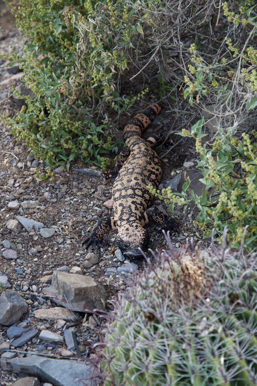 The deck replacement project is coming along, albeit at a slower pace than originally predicted, (see “Recent News”), but I’ve had the chance to spend a lot of time outdoors enjoying the flora and fauna as a result. Yesterday, as the sun was setting, I caught a glimpse of movement on the footpath to the south of the deck – it was an adult Gila monster out searching for food! It wandered along the path, eventually making its way up the slope, pausing to rest in the shade created by the perforated steel wall surrounding the deck on three sides.