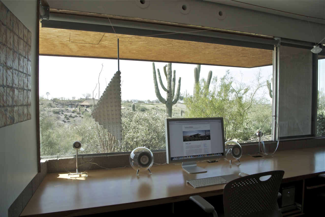 The Ferguson Hill loudspeaker system was recently installed in the Office on the Lower Level. I’ve inserted an image Martha captured a couple of days after the installation was complete – you can literally see through the speaker enclosures! The two low frequency modules are to the immediate left and right of the Apple Cinema Display, with the high frequency modules to the immediate left and right of the low frequency modules. The Ferguson Hill amplifier module is tucked away discretely on the shelf in between the two chairs. First impressions of the sound? …magical!