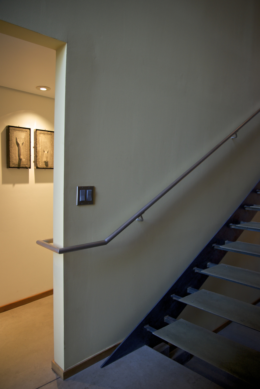 This image of the new railing recently installed is reflective of what we’re trying to achieve – subtle refinements that result in renewed visual appeal. A glimpse of the mixed media pieces hanging in the hallway, the shadows, the railing itself wrapping around the wall – familiar, yet new!